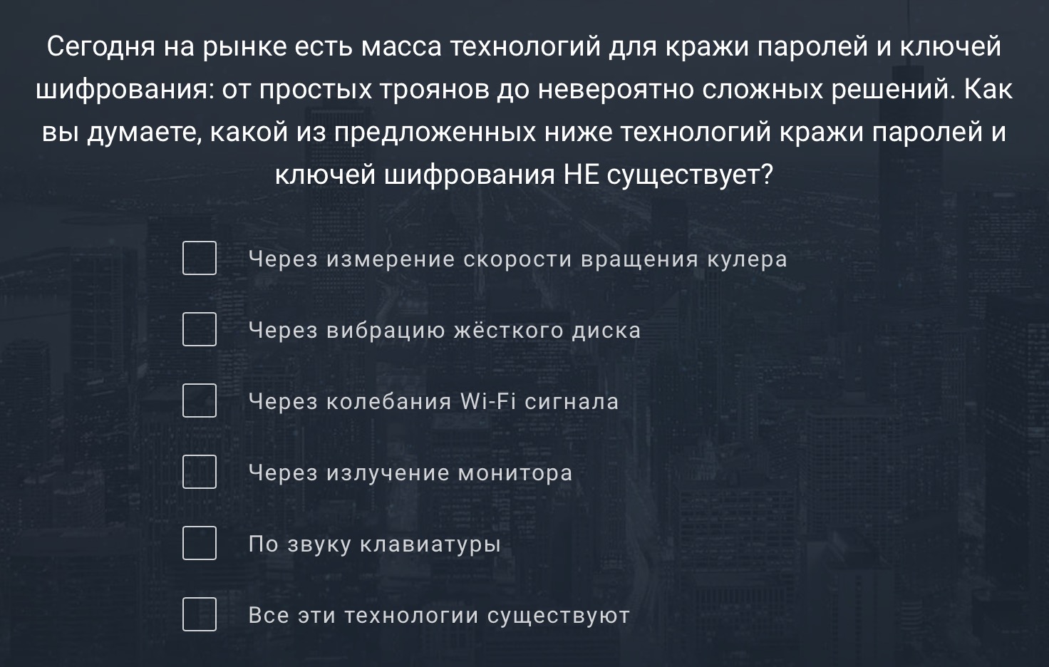 Эта глава была написана вследствие комментария подписчика, который посетовал, что в тесте знаний в области анонимности и безопасности в сети допущена неточность, а именно, что методы кражи пароля через анализ излучения монитора существуют.
