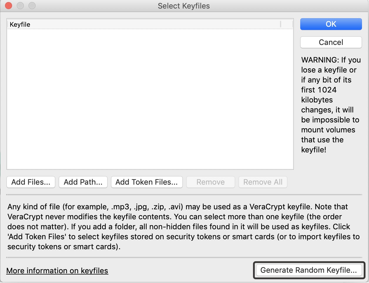 У вас откроется окно работы с ключами, я рекомендую вам сгенерировать новый ключ, нажав «Generate Random Keyfile…».