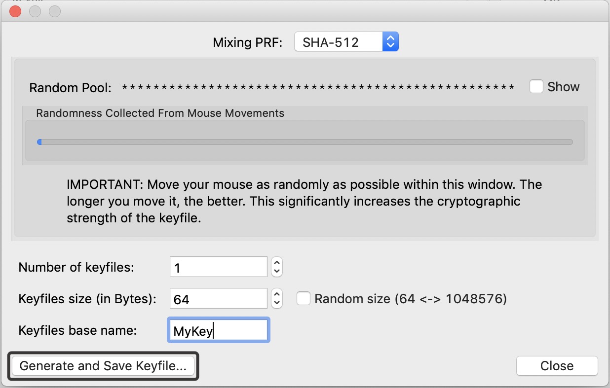 Вам надо придумать название ключа и нажать «Generate and Save Keyfile». Ключ будет создан, вам останется только сохранить его на microSD и закончить создание криптоконтейнера.