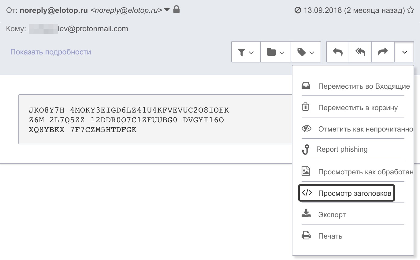 Если у вас почтовый ящик Protonmail, то для получения информации об IP-адресе отправителя в меню управления письмом выберите Просмотр заголовков.
