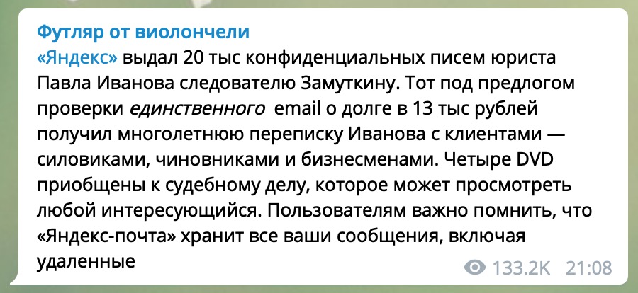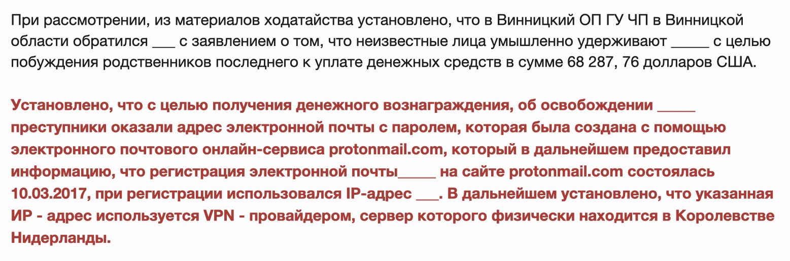 Сервисы, заботящиеся о праве на тайну переписки пользователей, не выдают доступ к содержимому электронных почтовых ящиков. Например, нам известны случаи, когда Protonmail передавал данные по запросу, они содержали IP-адрес при регистрации почтового ящика, но никакие письма выданы не были.