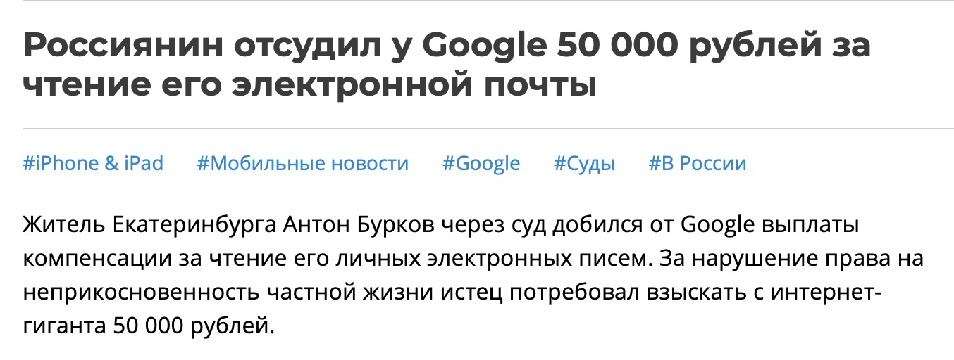 Это скриншот новости о том, как простой житель России отсудил у Google 50 000 рублей.