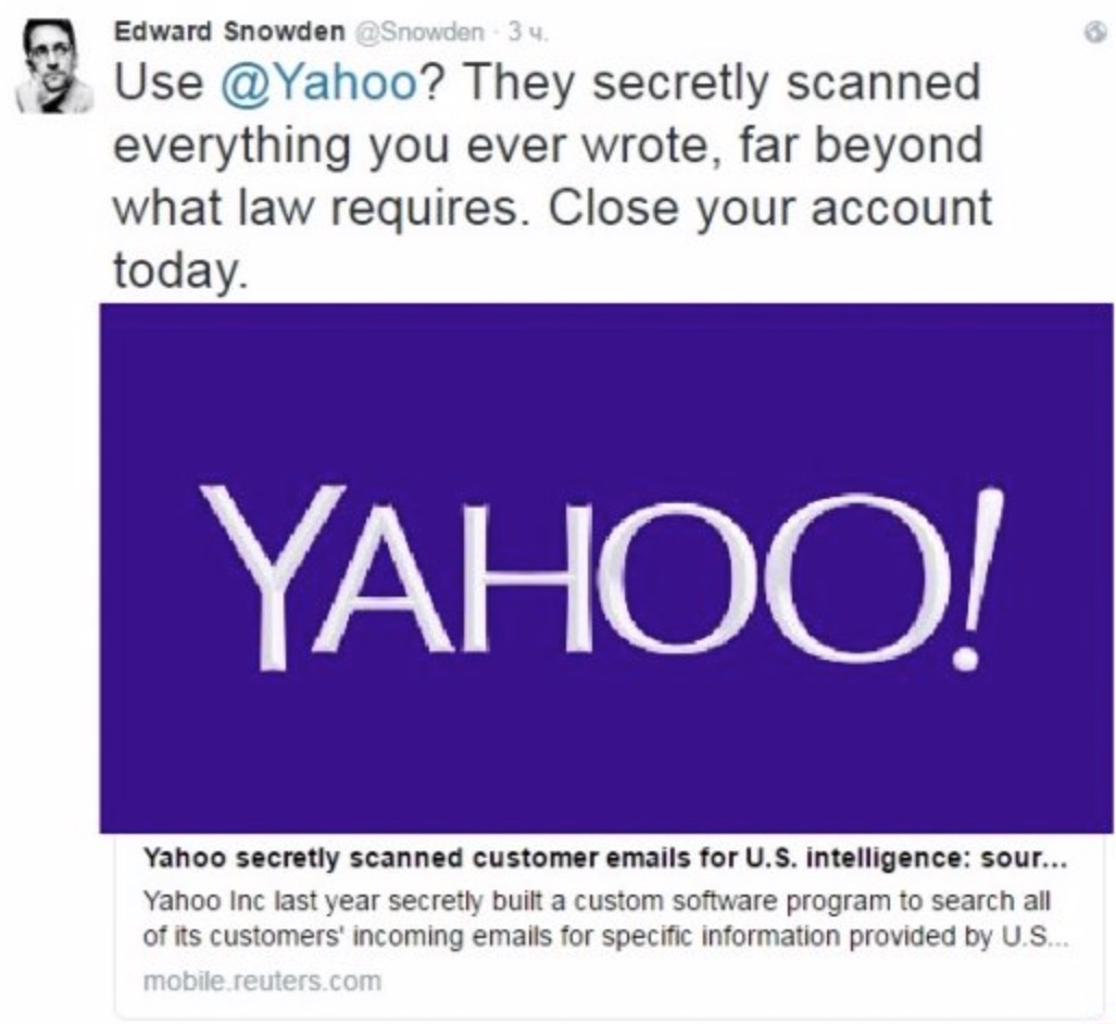 Перед вами скриншот твита Эдварда Сноудена, где он призывает удалить аккаунт Yahoo. Причиной стала публикация информации о предоставлении спецслужбам доступа к перепискам пользователей сервиса.