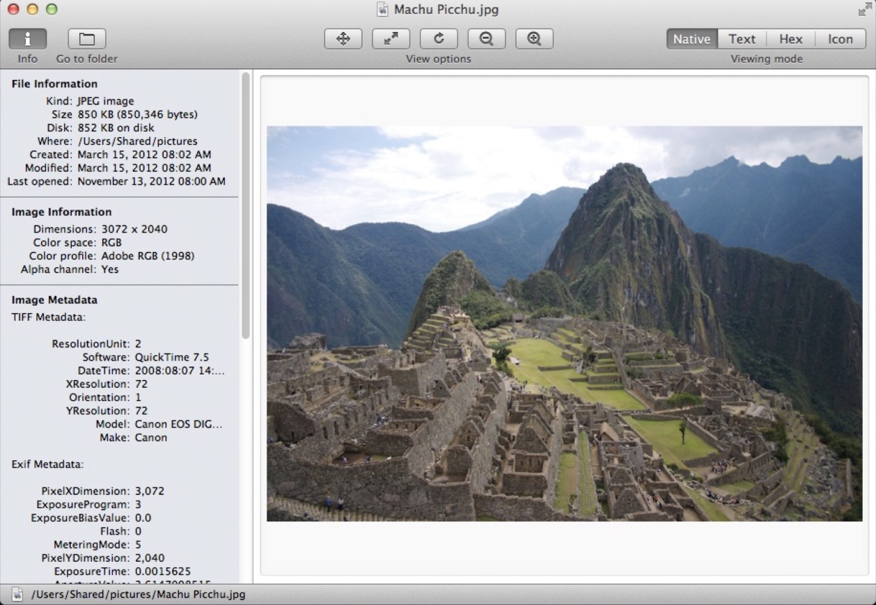 Для просмотра метаданных EXIF в macOS я рекомендую простую и удобную программу File Viewer. Она бесплатна и доступна для скачивания в App Store. Для просмотра метаданных EXIF просто запустите программу и перетащите файл в открывшееся окно.