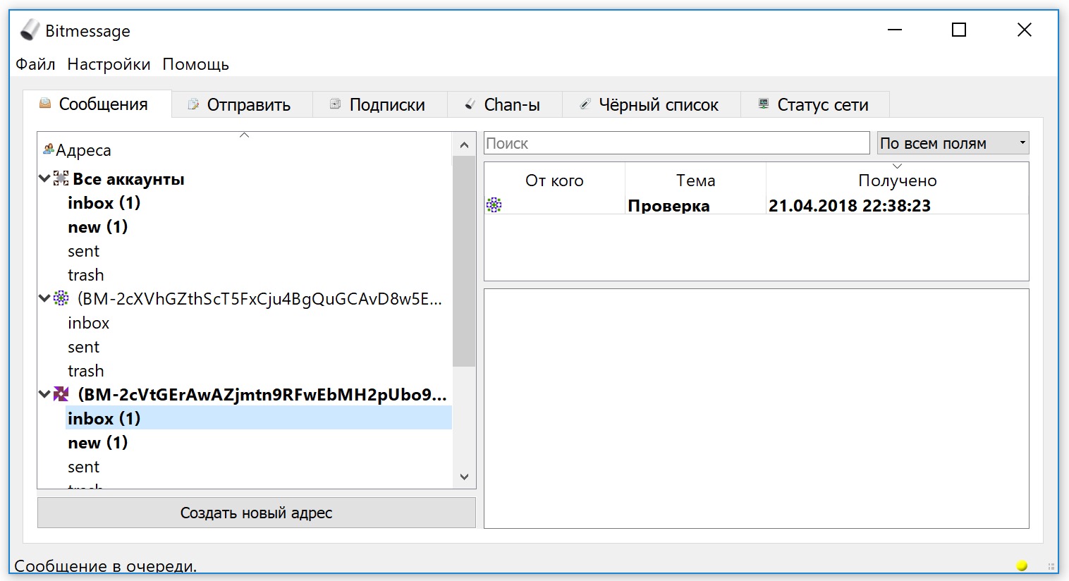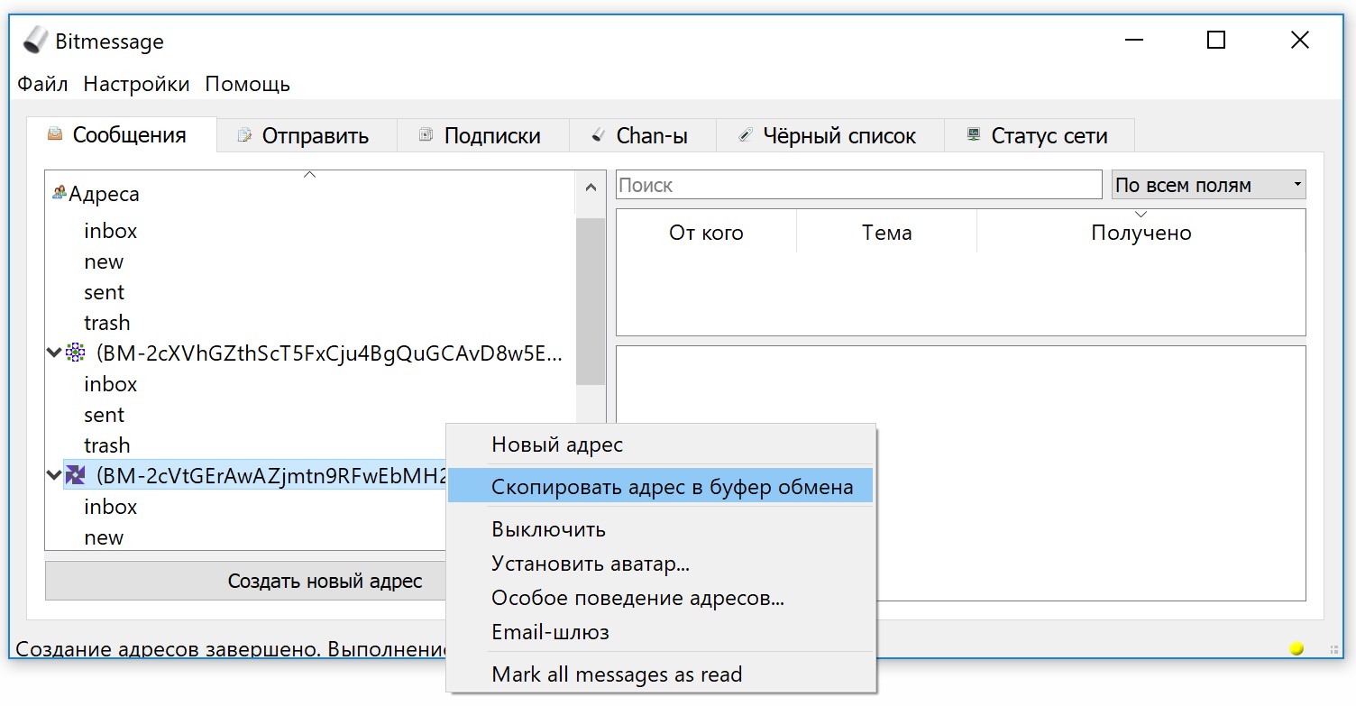 По завершении вы увидите свой адрес во вкладке Сообщения. Кликните по адресу правой кнопкой мышки, чтобы скопировать его. Этот адрес – публичный ключ, которым будут шифроваться сообщения для вас.