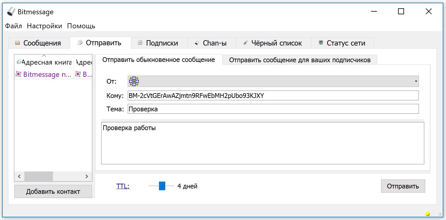 Если вы хотите, чтобы сообщение вам мог отправить другой пользователь Bitmessage, просто передайте ему один из адресов. Например, мой адрес BM-2cTC98PvJKxiru3yL1xD3dppRZcVzgEias.