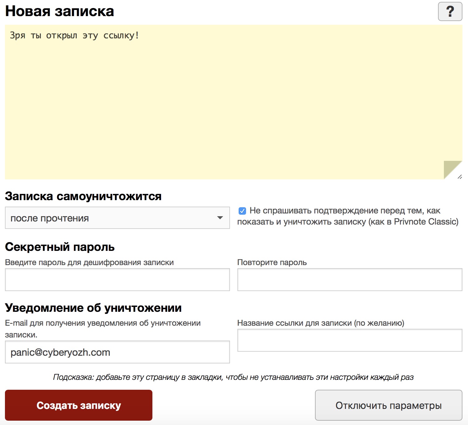 О сервисе одноразовых заметок Privnote мы уже писали ранее. Это очень полезный сервис, и если ранее мы использовали его для разрыва целостности информации в сообщениях, то теперь он послужит нам в создании ловушки для любителя читать чужую переписку.