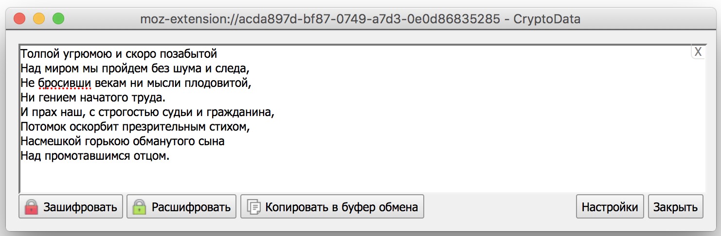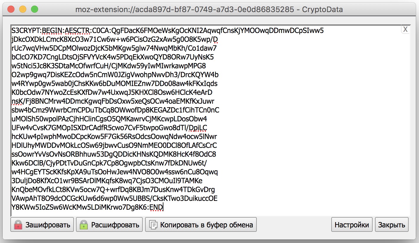 CryptoData – браузерное дополнение с функционалом шифрования данных для браузеров Mozilla Firefox и Google Chrome. Я настоятельно рекомендую вам его установить.