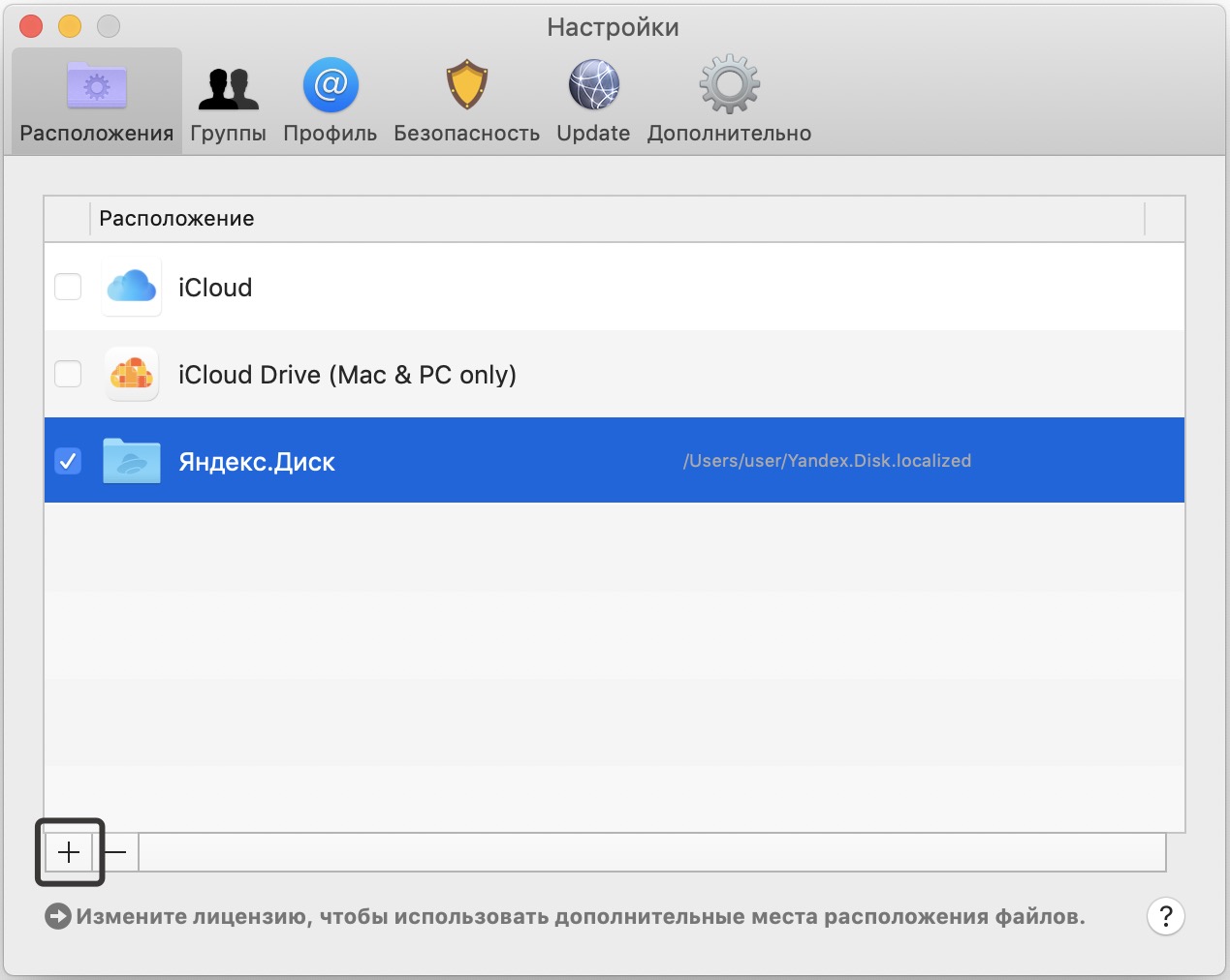 Я выбрал Яндекс.Диск. При запуске мне был предложен iCloud, поэтому для добавления Яндекс.Диска я нажал кнопку «Добавить» и указал папку Яндекс.Диска для шифрования.