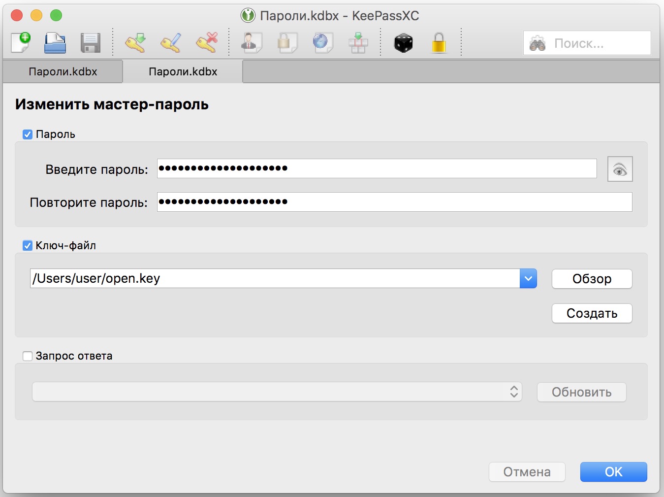 При запуске менеджера паролей KeePassXC на macOS вам необходимо будет выбрать Открыть базу данных, указать путь к сохраненной базе данных, затем ввести корректный пароль и предоставить доступ к файлу-ключу.