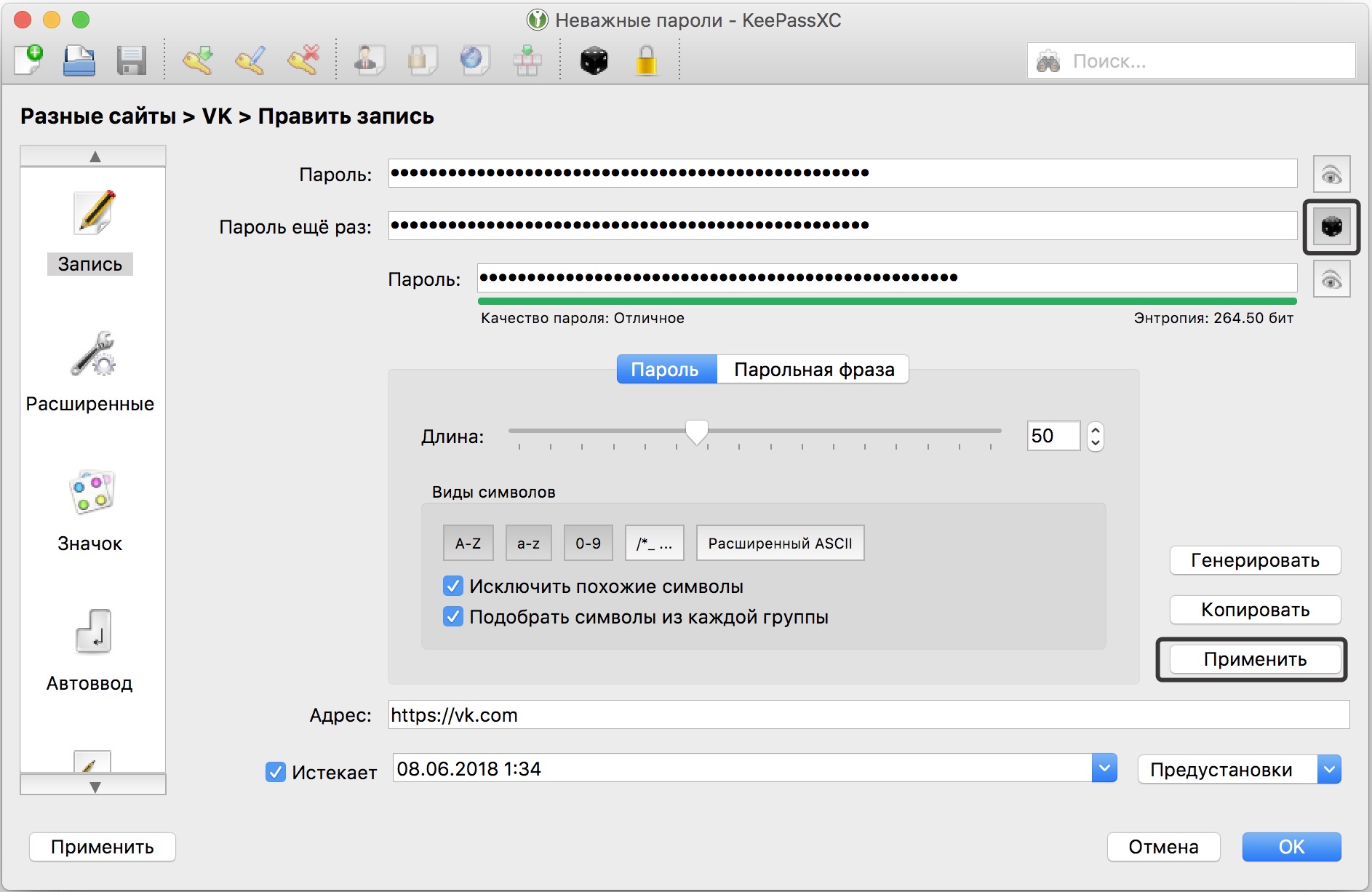 Для создания надежного пароля у KeePassXC есть отличное решение – встроенный генератор паролей. Около строки Пароль еще разнажмите на кнопку генератора паролей.Я рекомендую не выдумывать пароли самим, а доверить этот процесс заложенному в программу генератору, он поможет создать надежный пароль.