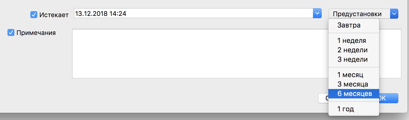 Перед добавлением пароля я бы хотел обратить ваше внимание на один из пунктов, а именно на пункт Истекает. Надеюсь, вы взяли за правило регулярно проводить смену паролей, и в этом вам может помочь менеджер паролей KeePassXC. При создании пароля выберите пункт Истекает и затем выберите предустановку на 6 месяцев.