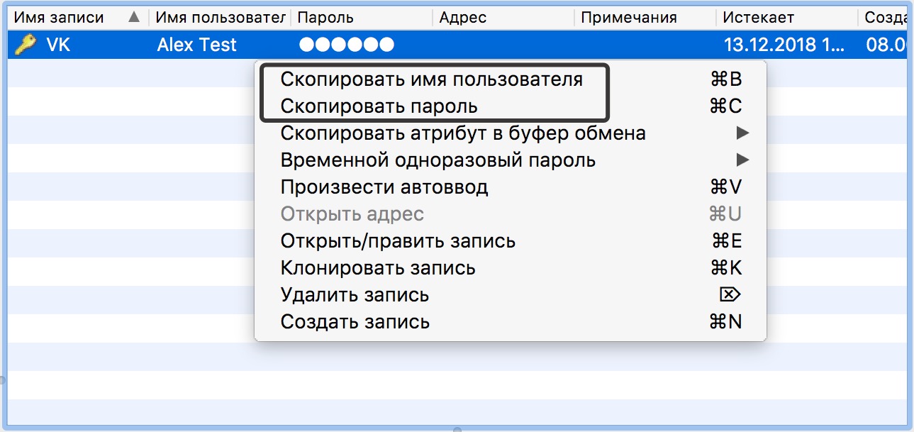 Для использования сохраненного пароля кликните на нужную запись правой кнопкой мышки.