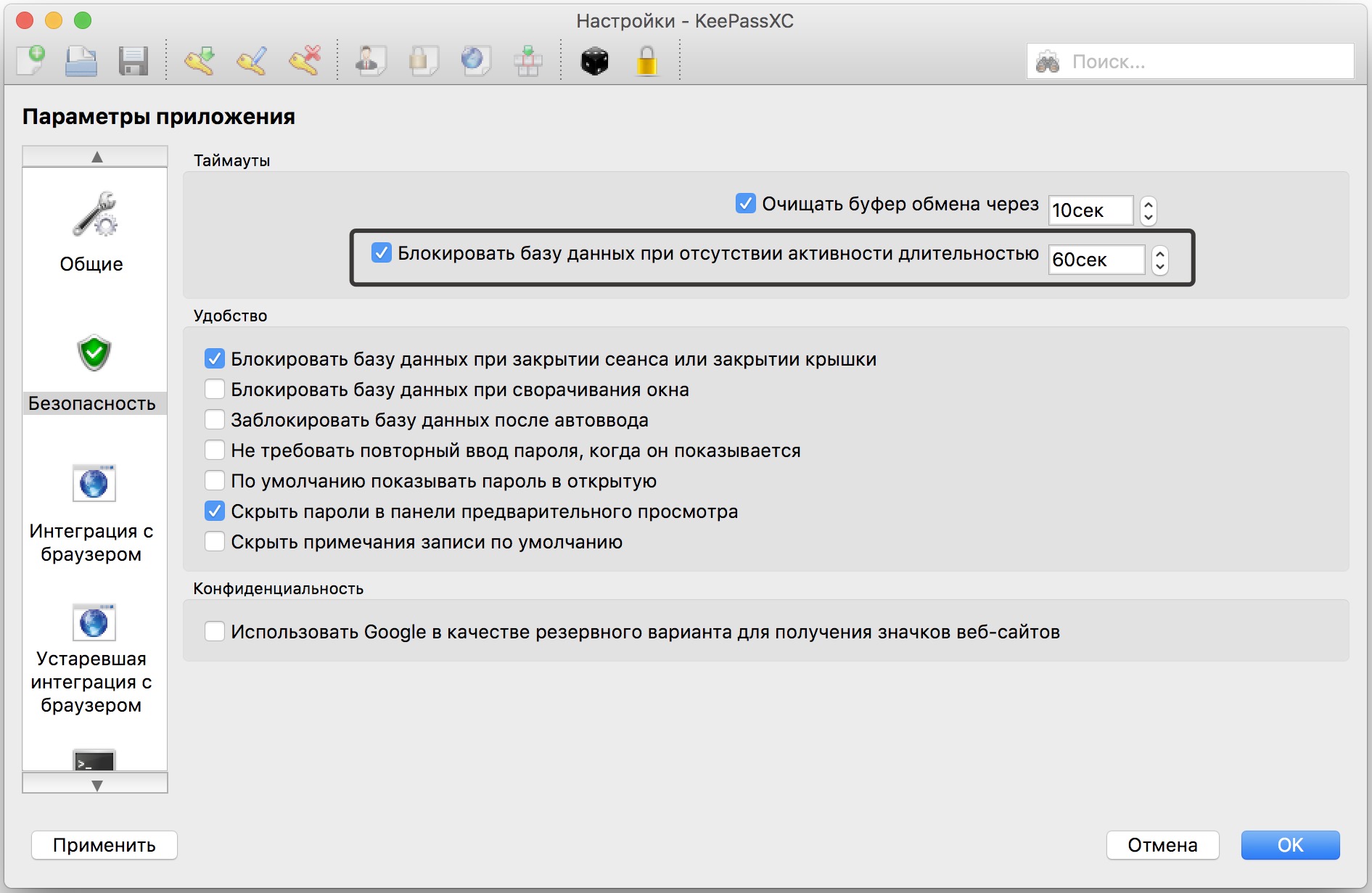 Перед началом постоянного использования KeePassXC вам следует настроить безопасность приложения, а именно – установить автоматическую блокировку базы данных паролей при неиспользовании компьютера в течение какого-либо времени.