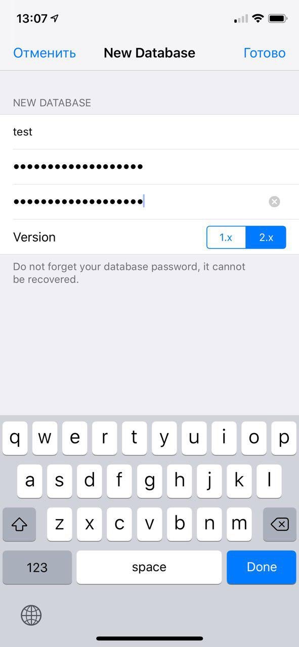 Для создания файла с паролями откройте приложение и нажмите кнопку «+» справа внизу. Придумайте название базы с паролями, надежный пароль, выберите версию 2.x. Файл с паролями создан!