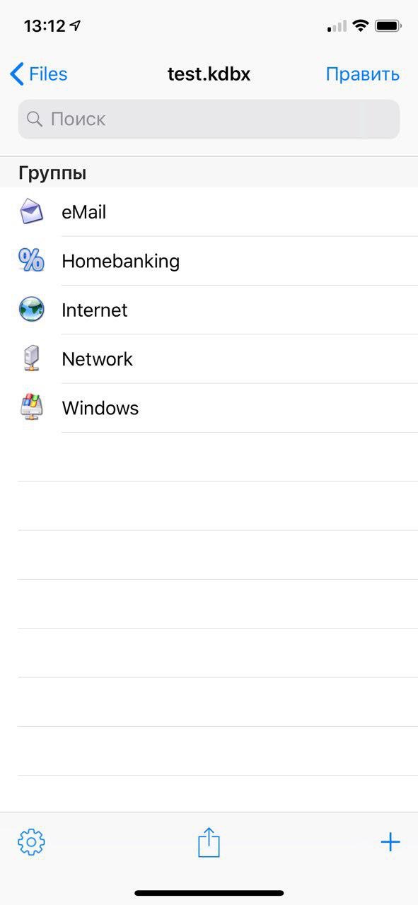 После открытия созданного файла с паролями вы окажетесь в меню с группами. По умолчанию MiniKeePass предлагает группы eMail, Homebanking, Internet, Network, Windows; вы можете удалить, изменить существующую группу или добавить новую. Для меня это были не самые подходящие группы, и я переименовал их в Банкинг, Соцсети, Сайты, Партнерки, Сервисы. Вы можете составить свой список.