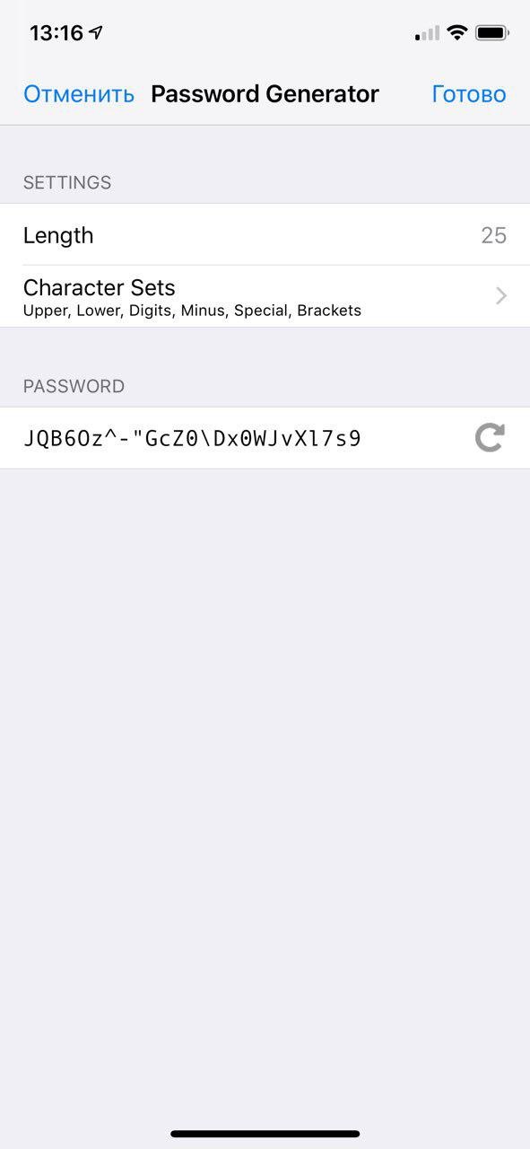 Для создания надежных паролей MiniKeePass предлагает встроенный генератор. Функция генератора паролей – генерация случайных паролей по заданным критериям. При создании записи нажмите на значок генератора паролей (гаечный ключ), создайте надежный пароль длиной в 25 символов или более, затем укажите его на сайте при регистрации.
