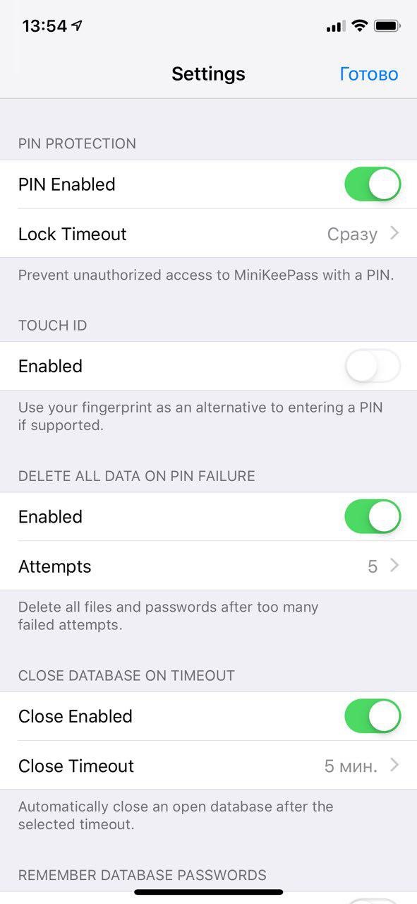 Первый уровень защиты – установка пароля на приложение (PIN PROTECTION), а также установка опции уничтожения данных после пяти неудачных попыток ввода пароля (DELETE ALL DATA ON PIN FAILURE). Выберите опцию PIN Enabled и укажите пин-код, активируйте систему уничтожения паролей, при этом опцию TOUCH ID рекомендуется отключить.