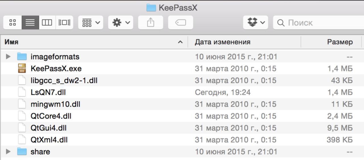 Опираясь на это, мы рекомендуем вам называть свои контейнеры как-нибудь нейтрально и пробовать их маскировать под программные файлы. Например, открываем у себя папку с менеджером паролей KeePassX и видим какие-то непонятные файлы с расширением *.dll. Создавая криптоконтейнер, назовем его LsQN7.dll и положим в эту папку. Только мы будем знать, что LsQN7.dll на самом деле криптоконтейнер.