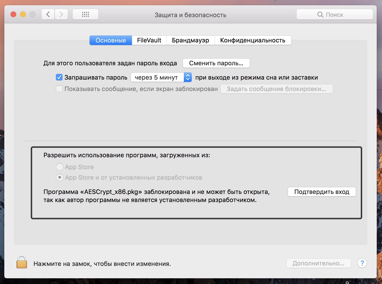 Вероятно, для установки вам потребуется зайти в настройки безопасности macOS и разрешить установку AES Crypt.