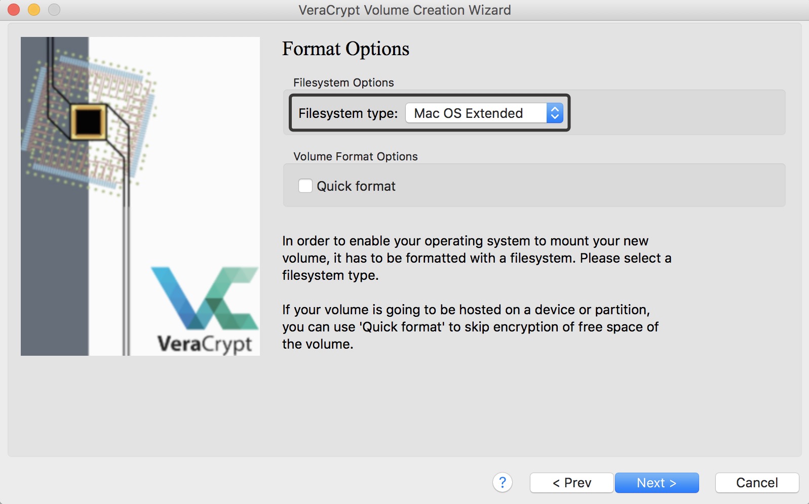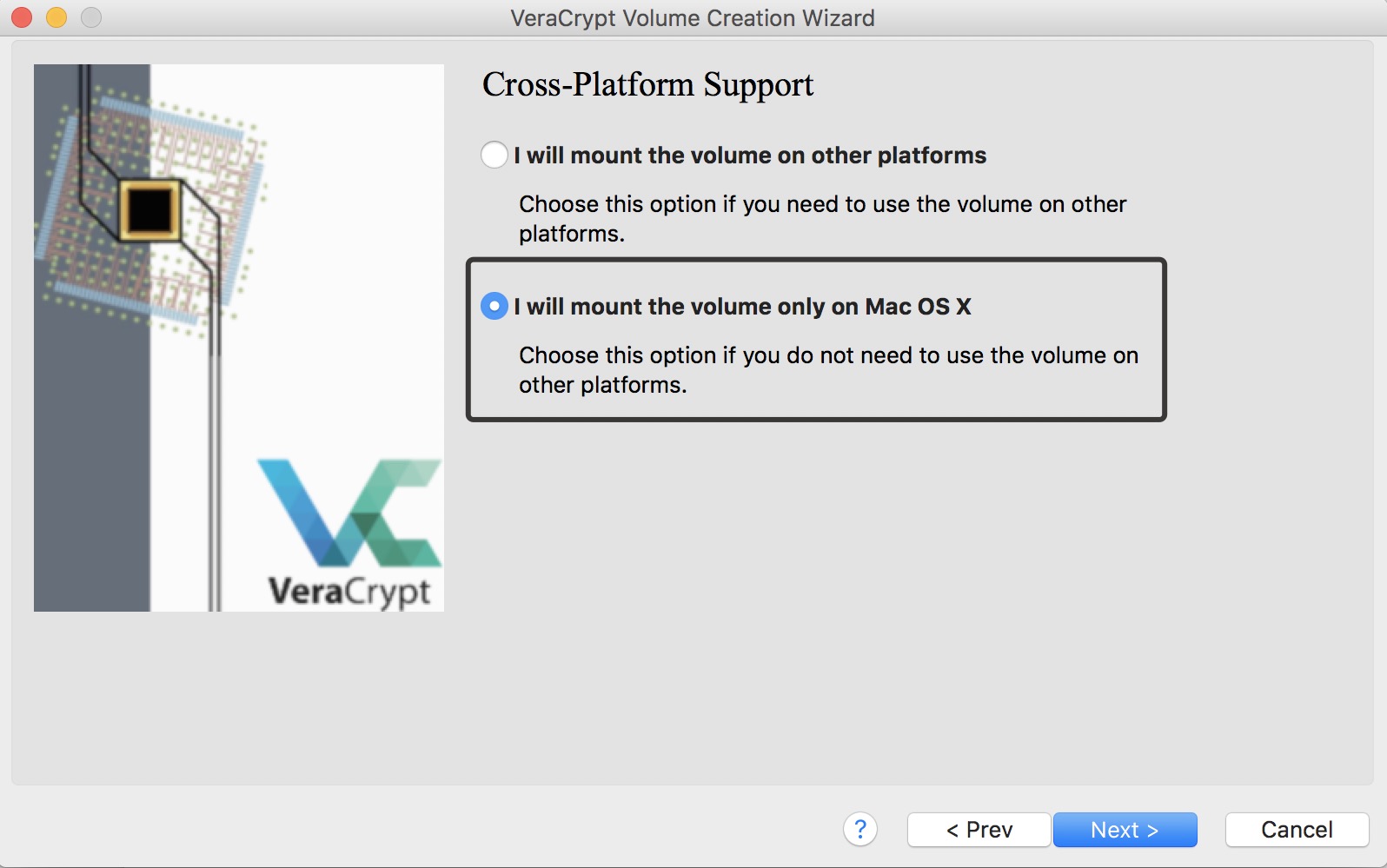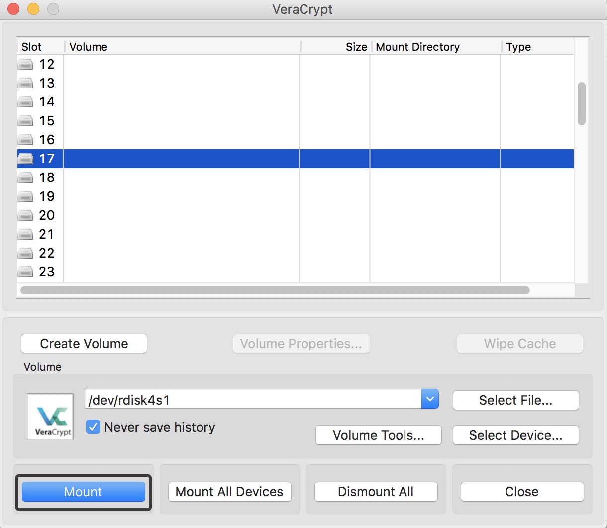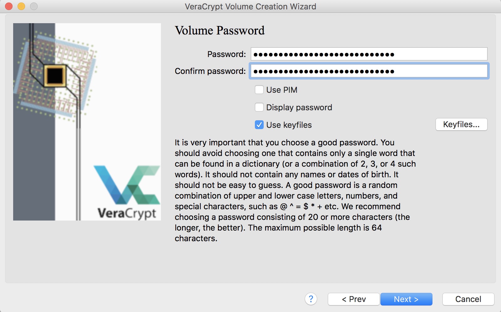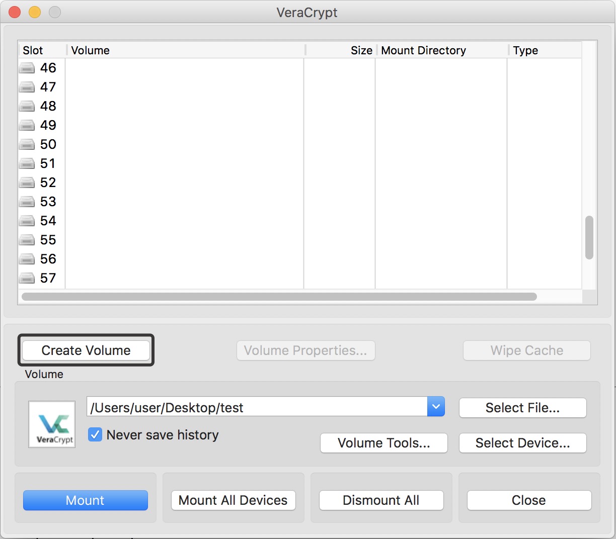 Сама процедура не сильно отличается от создания криптоконтейнера, и некоторые моменты, как, например, создание файла-ключа, мы второй раз описывать не станем. Прошлая часть сопровождалась скриншотами VeraCrypt, запущенного на Windows, а здесь мы будем использовать VeraCrypt, запущенный на macOS.