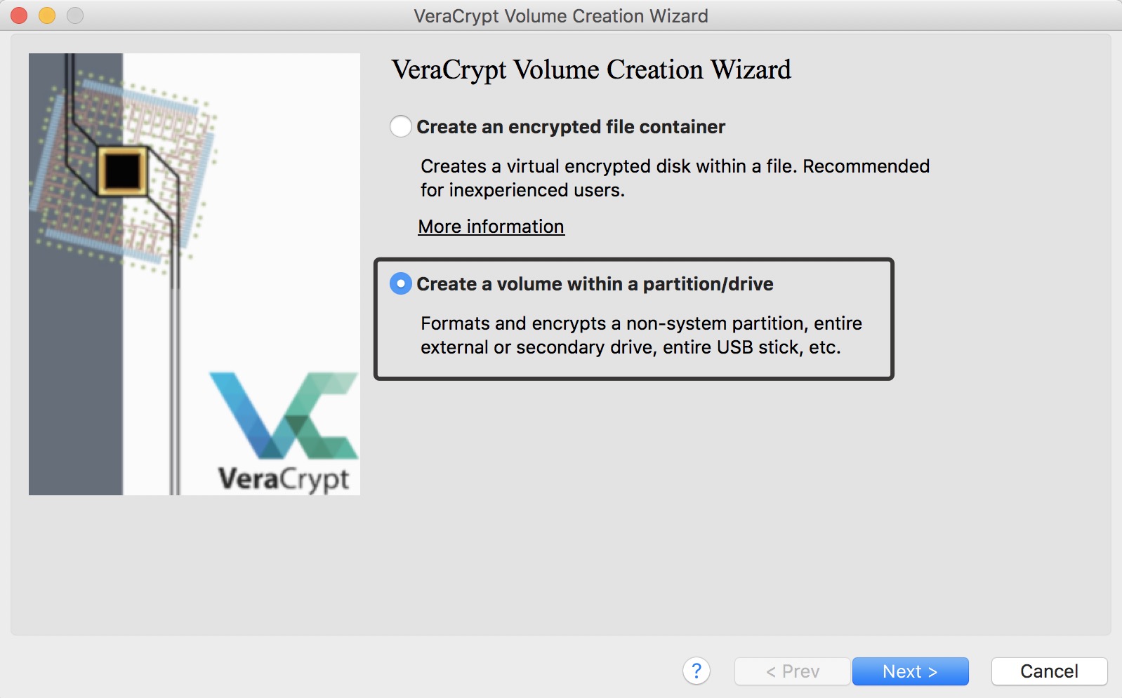 Затем выберите второй пункт - Create a volume within a partition/drive. Первый же пункт, который был выбран по умолчанию, предлагает нам создать просто файловый контейнер выбранного размера.