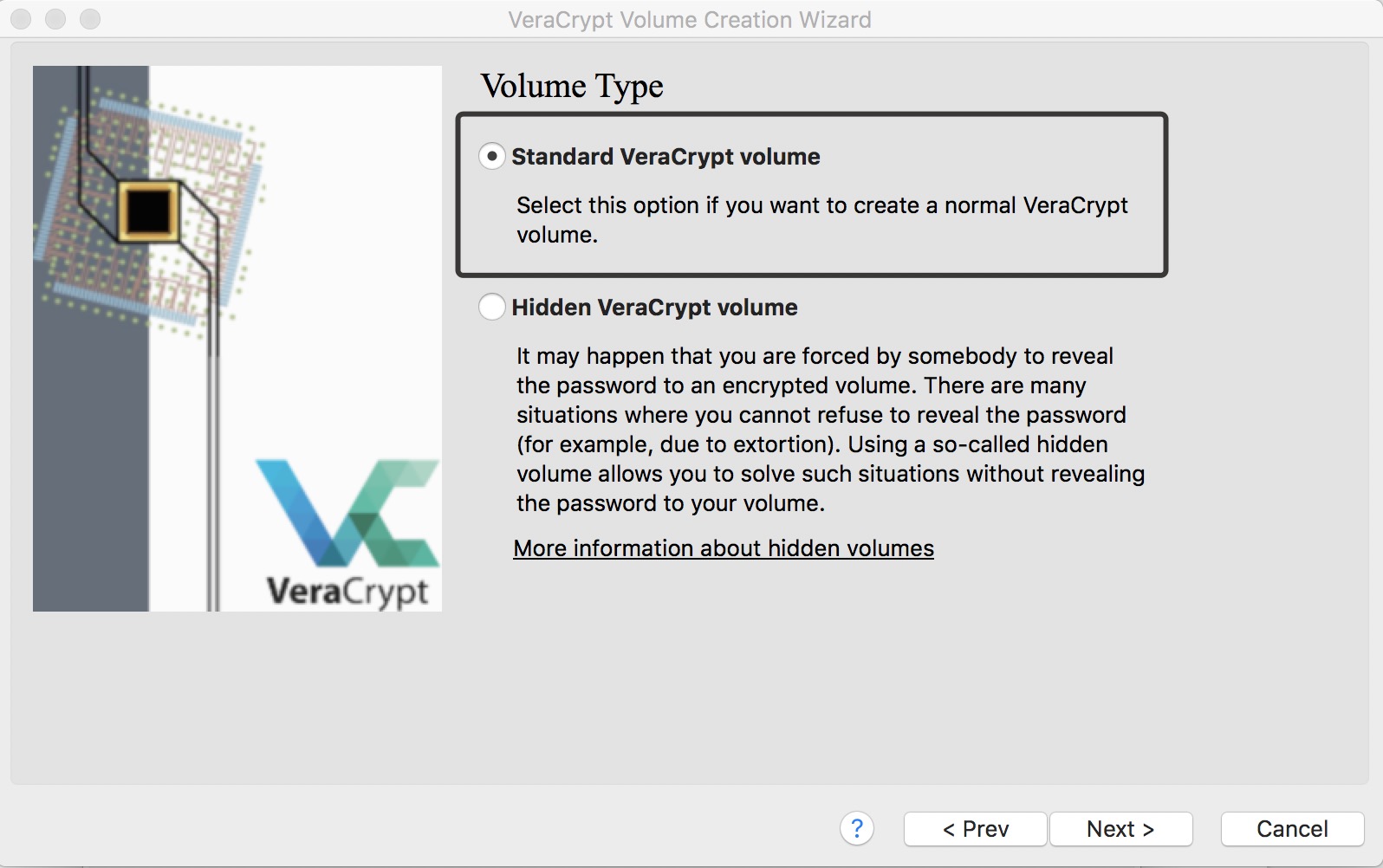 Программа предложит выбрать тип зашифрованного контейнера. Их два - стандартный и скрытый. Пока мы выбираем пункт Standard VeraCrypt volume, использование скрытого контейнера будет описано в одной из следующих частей.