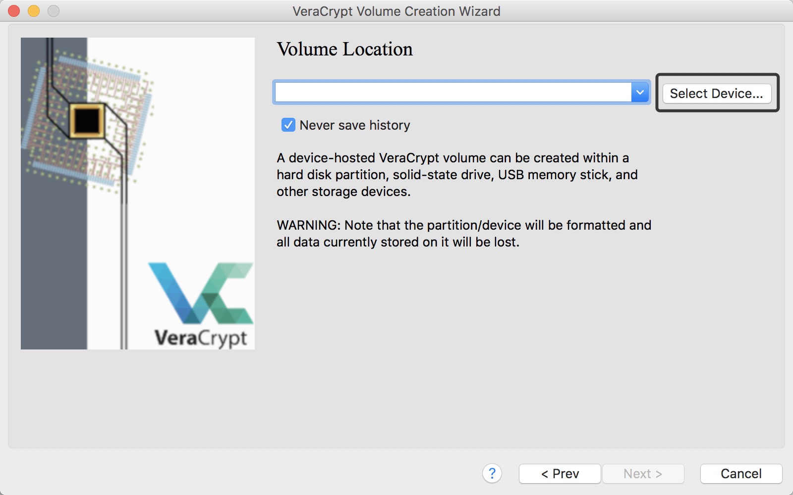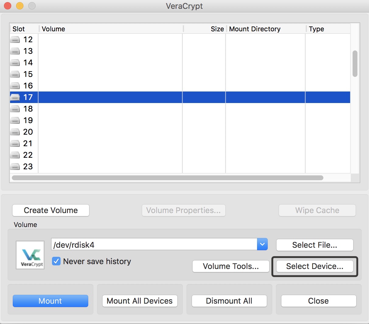 Подключите зашифрованное устройство к компьютеру. При этом вам может быть выведено уведомление о невозможности прочтения устройства - проигнорируйте его. Запустите TrueCrypt или VeraCrypt. Выберите место для монтирования и нажмите Select Device.
