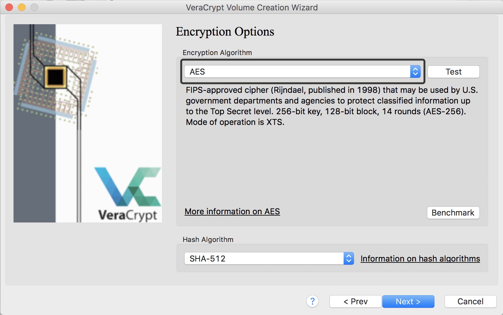 Далее указываете алгоритм шифрования. Помните, что алгоритм шифрования влияет на скорость работы с файлами, и если вы планируете шифровать носитель более 16 ГБ, я рекомендую использовать AES. Для девайсов менее 16 ГБ можно использовать AES-Twofish-Serpent.