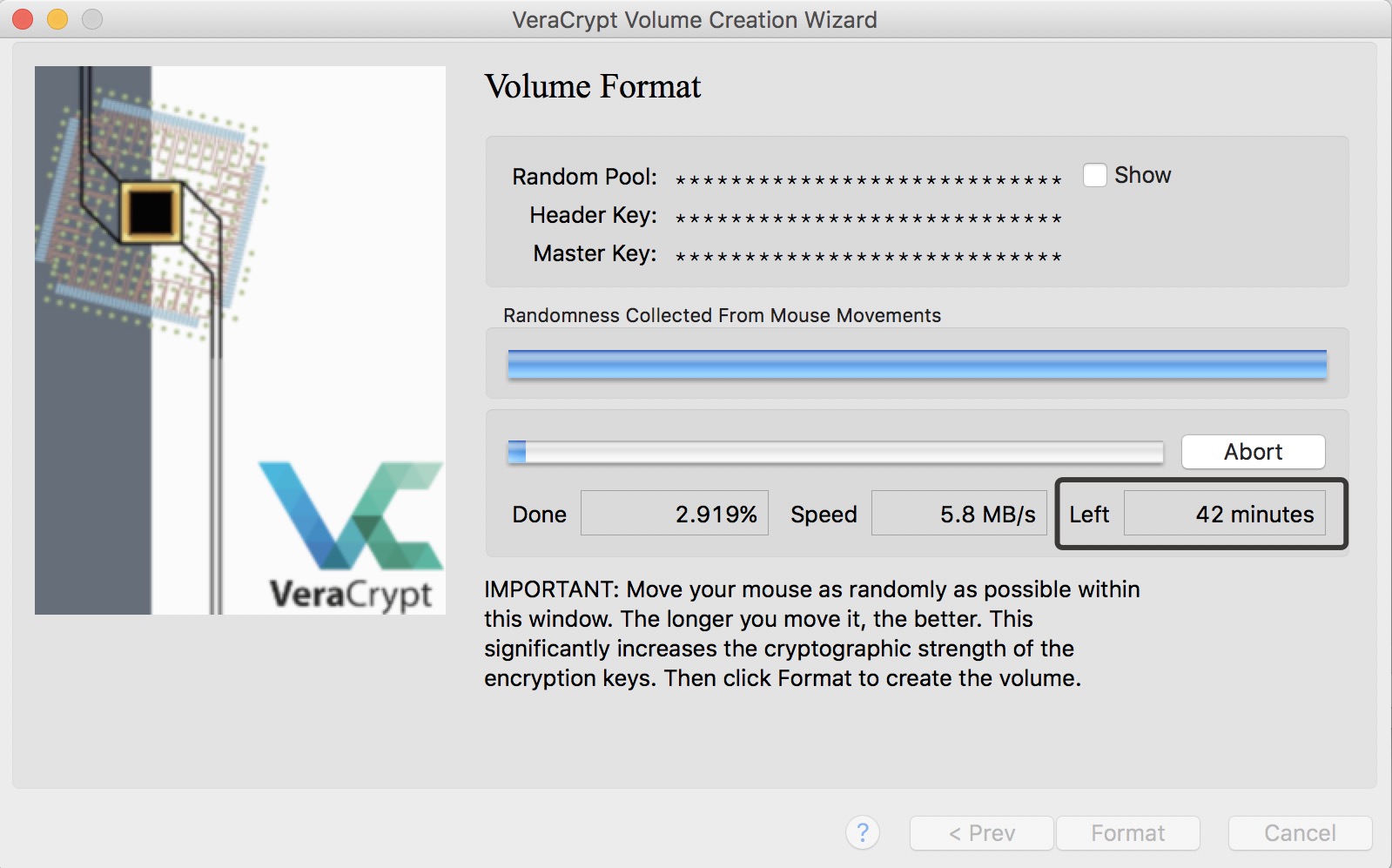 Теперь требуется поводить мышкой по экрану, чтобы VeraCrypt сгенерировала надежный ключ (этого шага нет в TrueCrypt).