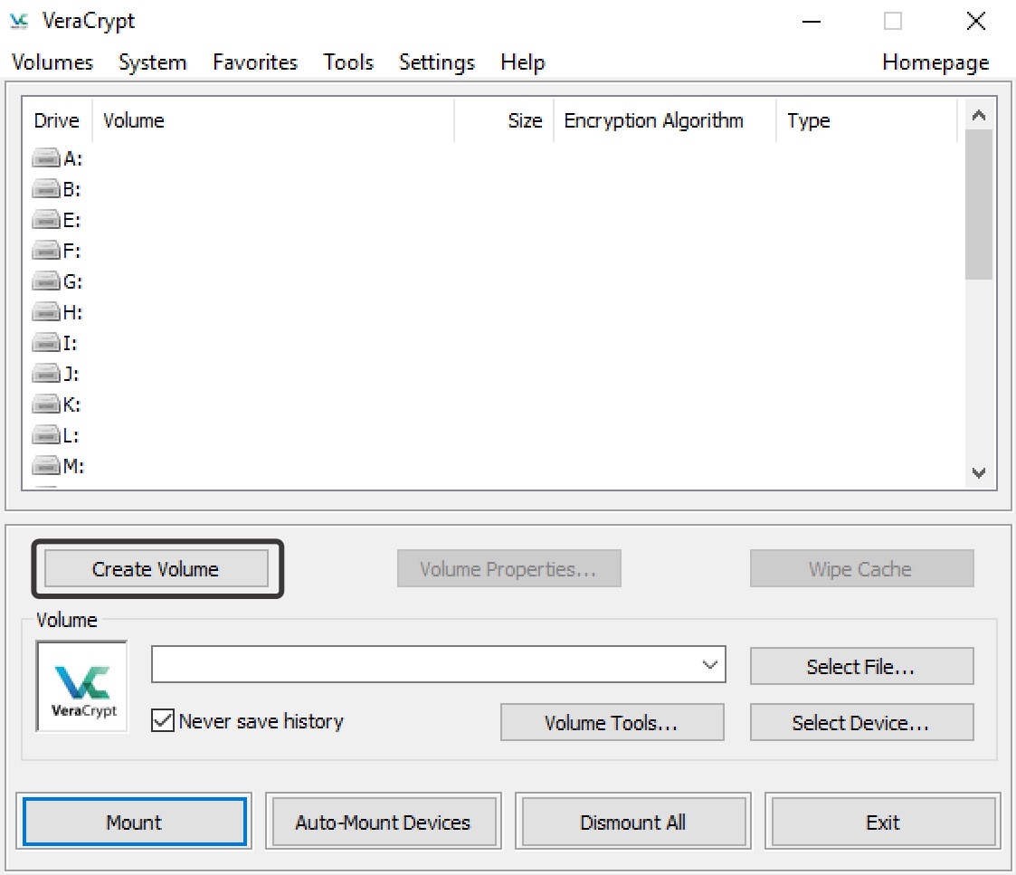 Начнем с создания криптоконтейнера. Запускаем VeraCrypt / TrueCrypt и в главном окне жмем на кнопку Create Volume.