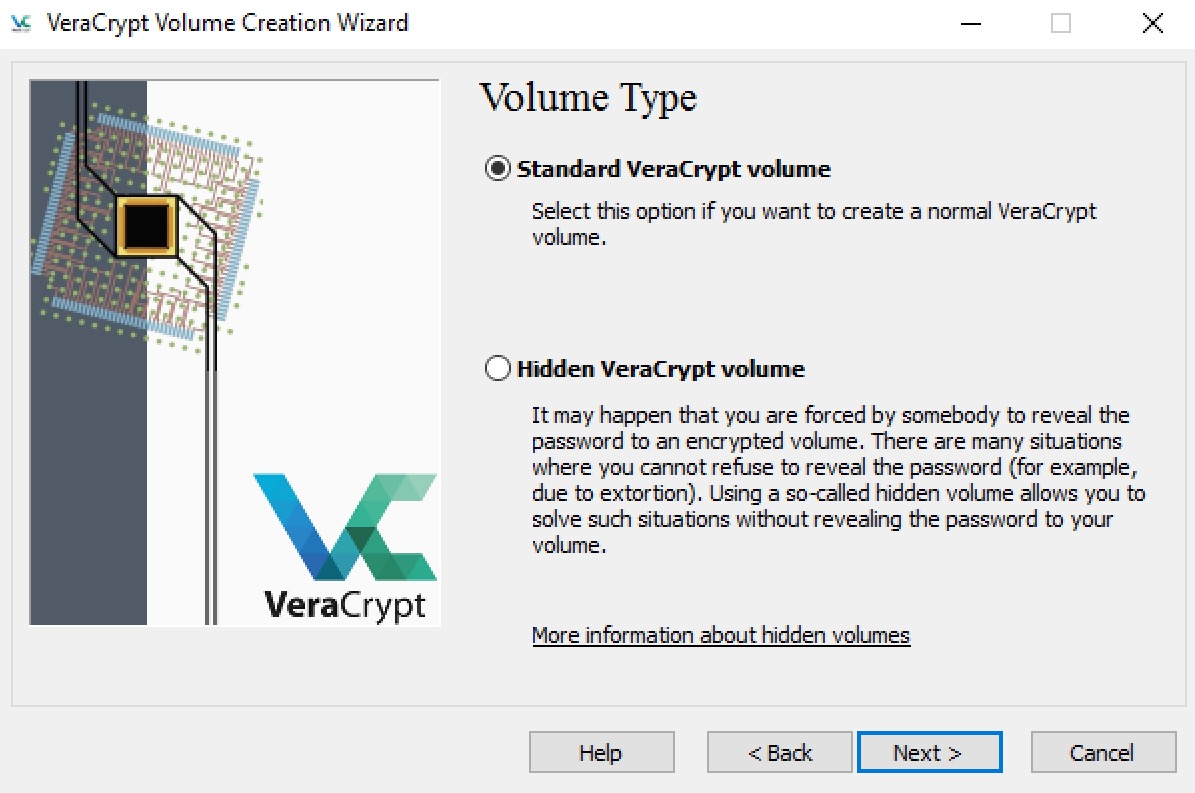 На следующем шаге программа уточнит у вас, какой тип криптоконтейнера вы хотите создать: стандартный или скрытый. В этом курсе мы научим вас создавать скрытые криптоконтейнеры, а сейчас выберите стандартный криптоконтейнер - Standard VeraCrypt volume.