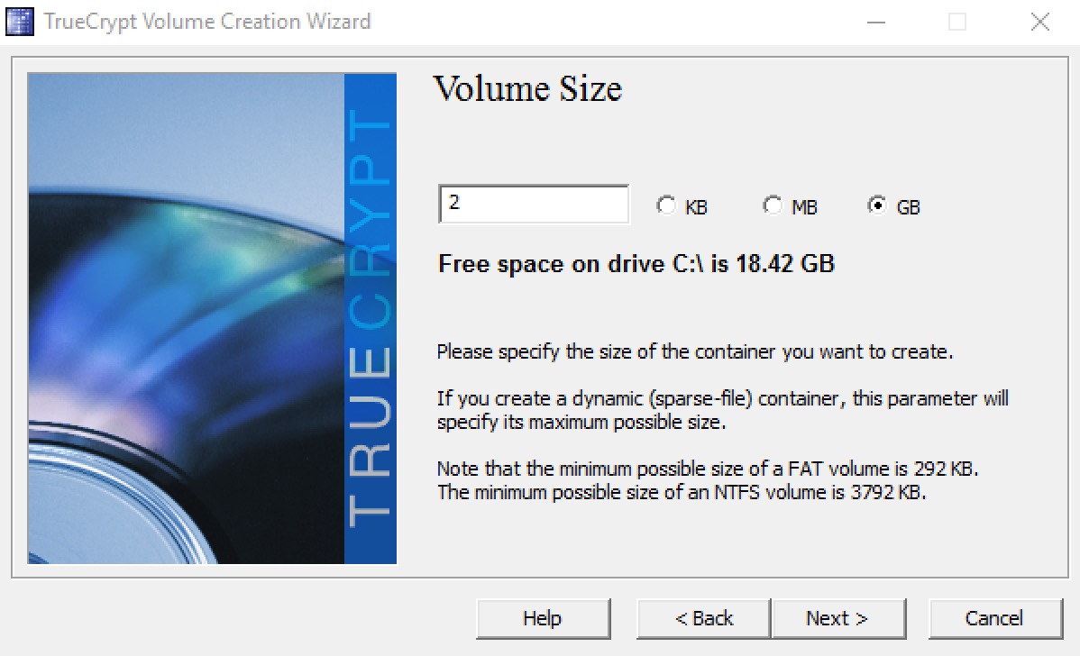 Далее система предложит вам указать объем памяти создаваемого криптоконтейнера. Обратите внимание на необходимость создавать криптоконтейнер с учетом использования 5% (но не более 100 МБ) под системную информацию и ключ для дешифрования информации.