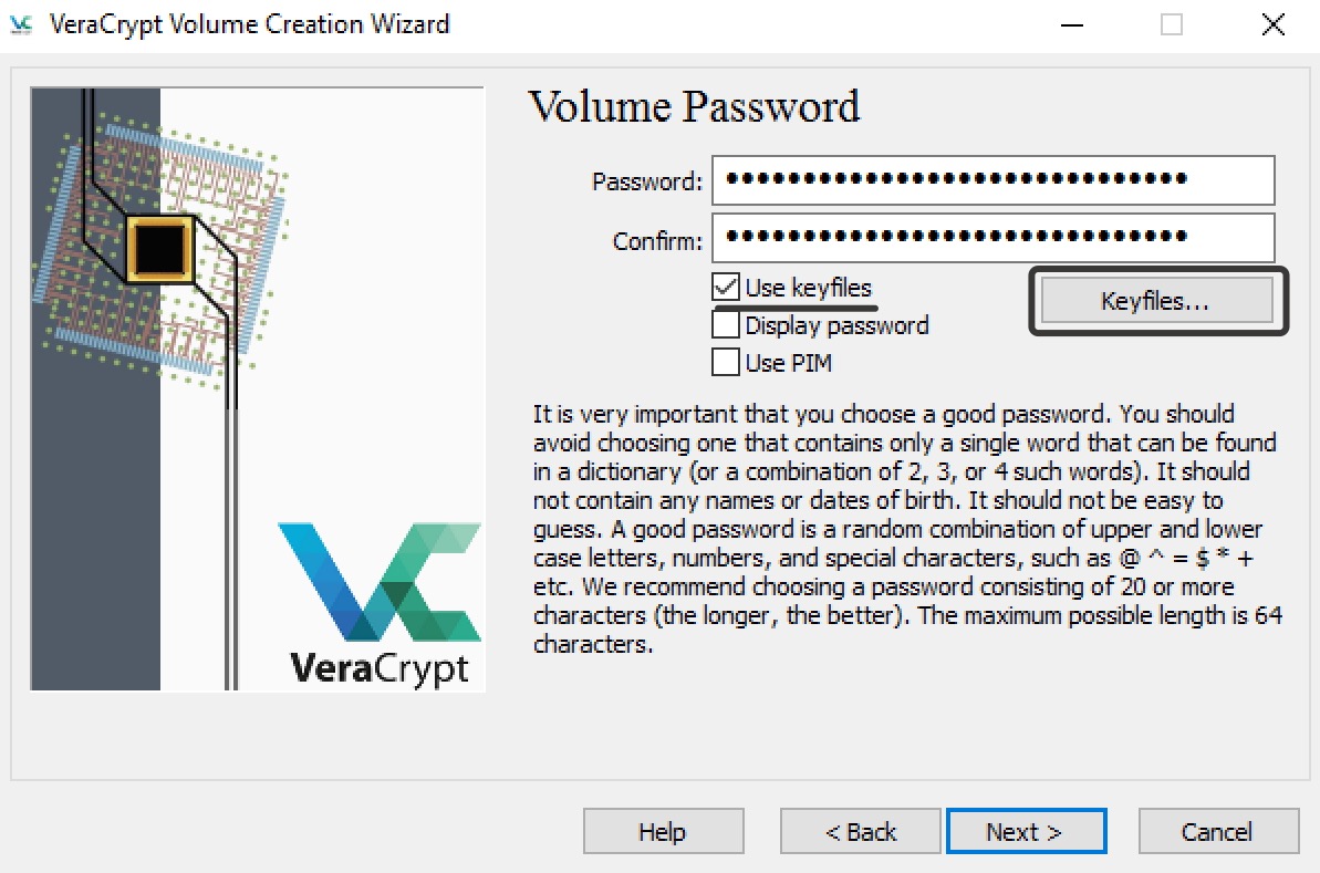 После выбора выделяемого объема памяти нам необходимо будет создать пароль для дешифрования криптоконтейнера. Мы настоятельно рекомендуем для максимальной защиты использовать в связке с паролем файлом-ключом. Для этого активируйте опцию Use keyfiles.