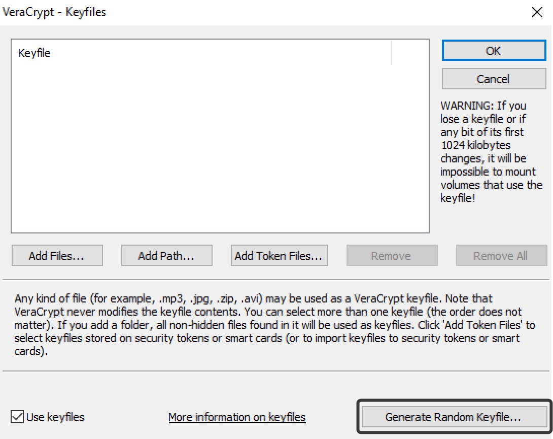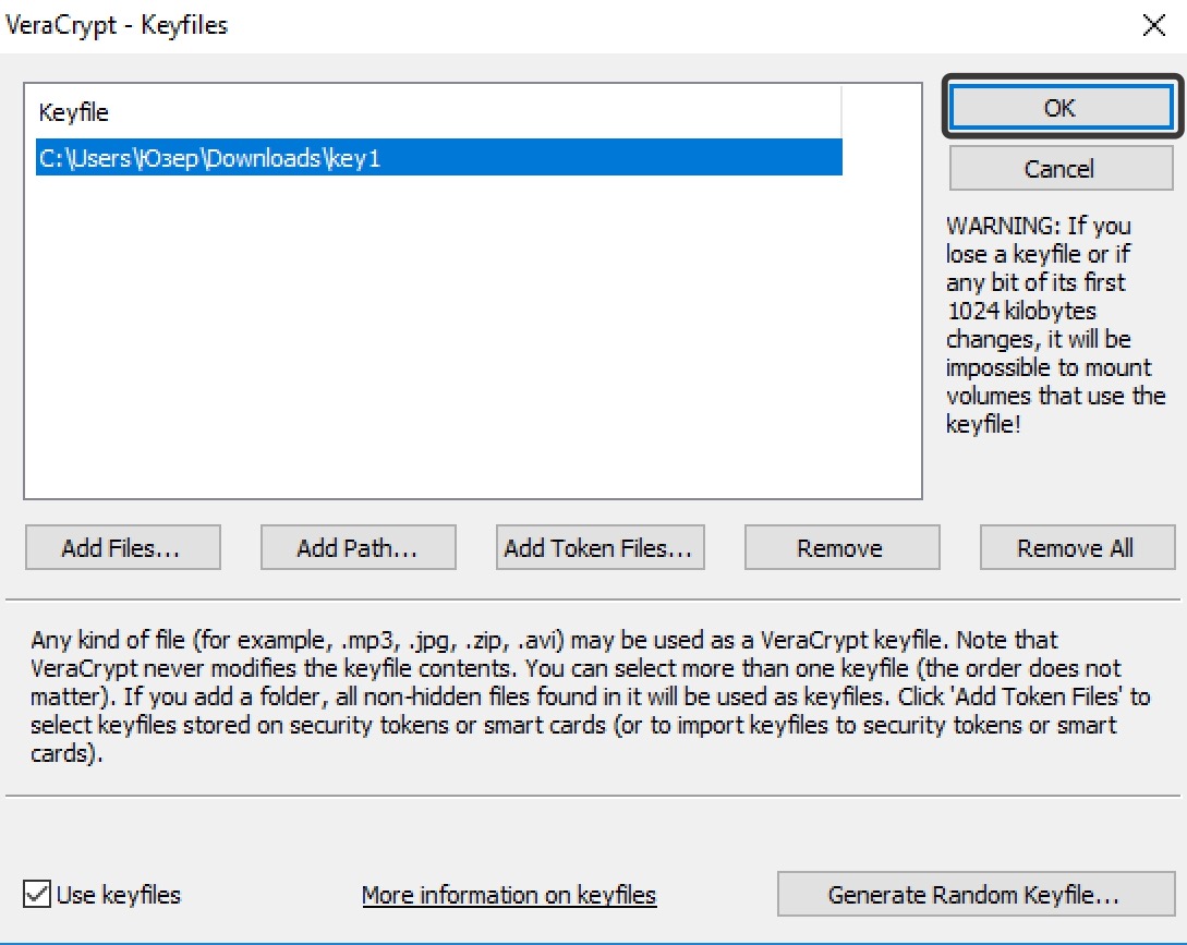 Закончив создание ключа, нажмите Add Files… и добавьте созданный ключ в список ключей VeraCrypt / TrueCrypt, затем выберите его в списке и нажмите ОК.