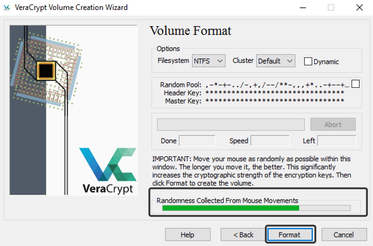 На следующем этапе программа предложит вам выбрать файловую систему. Пользователям Windows мы рекомендуем NTFS. После выбора файловой системы для создания криптоконтейнера нажмите Format.