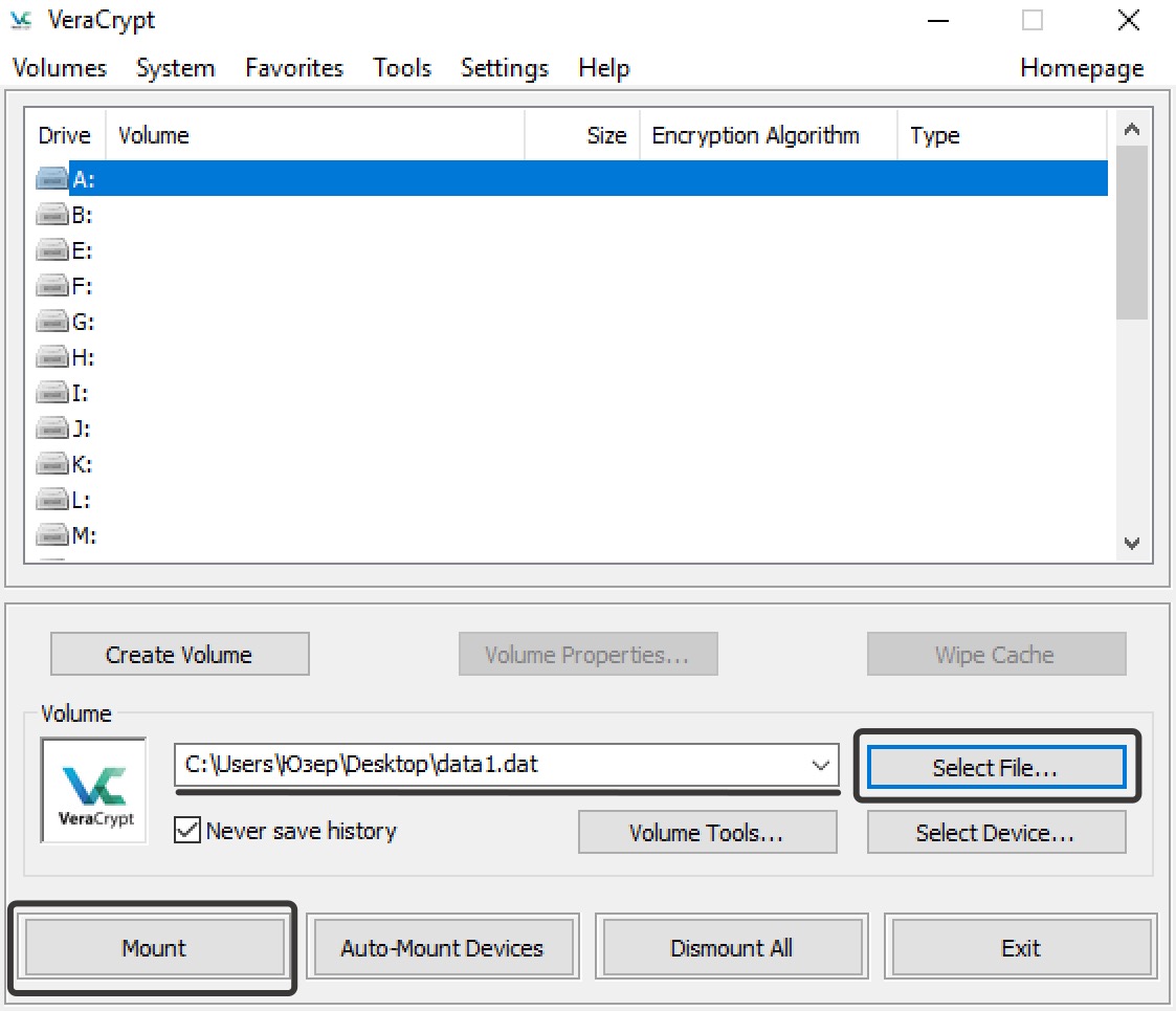 Он может отличаться, вместо букв могут быть цифры, грамотно это называется Список дисков. Не пугайтесь и не теряйтесь, выбирайте любую свободную букву / цифру и жмите кнопку Select File. Выберите созданный ранее криптоконтейнер и нажмите Открыть / Open.