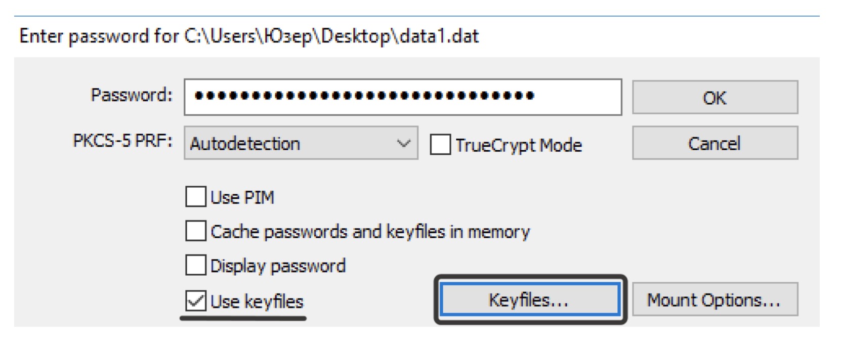 Для монтирования криптоконтейнера необходимо ввести корректный пароль. Если вы использовали файл-ключ, необходимо указать к нему доступ. Для этого около Use keyfiles ставим галочку, затем жмем на кнопку Keyfiles.