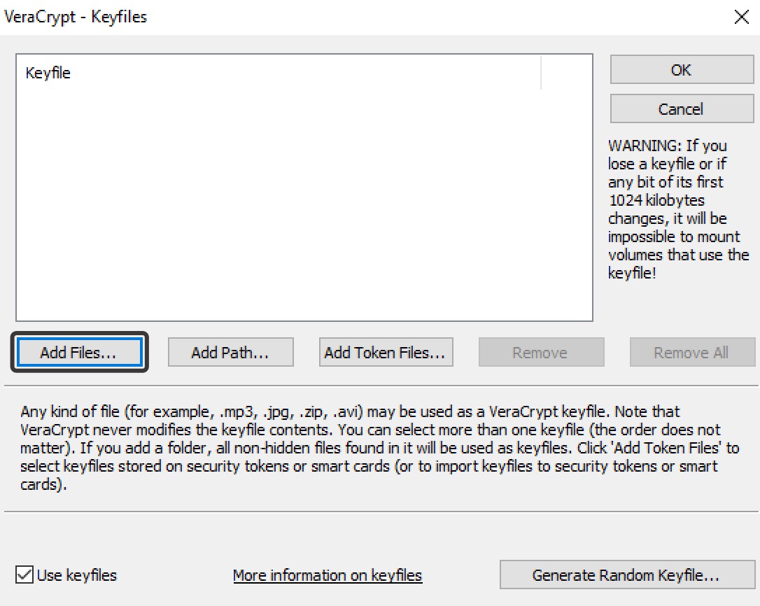 В открывшемся окне выберите Add Files, если вы хотите добавить свой файл в качестве ключа, или Generate Random Keyfile, если хотите создать файл-ключ.