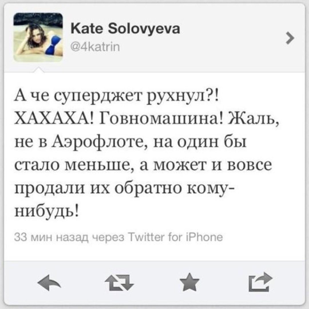 В тот же день бортпроводница «Аэрофлота» достаточно цинично прокомментировала трагедию в «Твиттер».