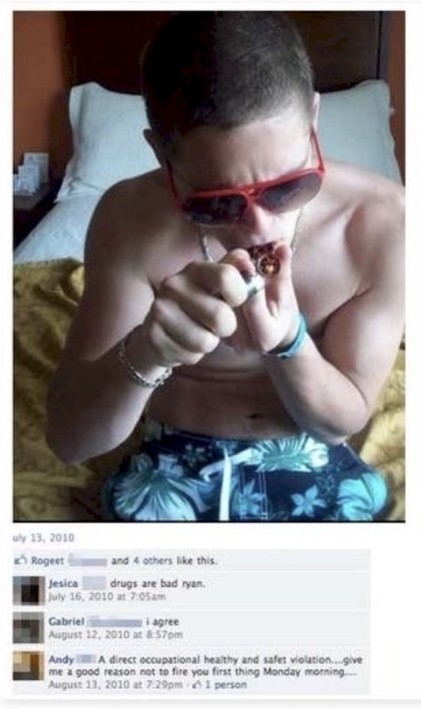 Молодой человек на фотографии ниже решил начать утро с раскуривания марихуаны. Но покурить тихо ему показалось мало и он опубликовал фотографию в Facebook, где ее увидел начальник. За употребление наркотиков перед работой молодой человек был уволен.