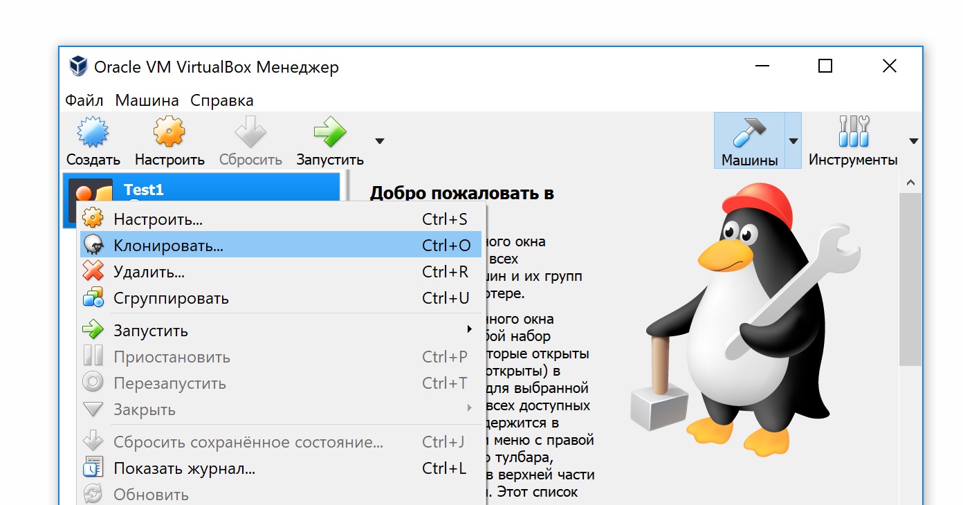 Чтобы не создавать новую виртуальную машину, есть два пути. Первый – создать образцовую систему и в дальнейшем просто клонировать ее. Вы создаете виртуальную машину, устанавливаете систему и все программы, необходимые вам, после этого выбираете созданную виртуальную машину и жмете “Клонировать”.