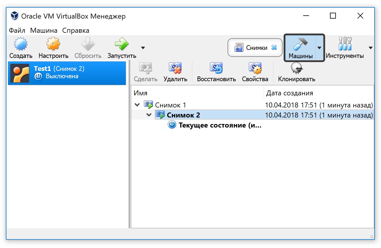 Для создания снэпшота в меню VirtualBox выберите Машины > Снимки и затем “Создать”. Каждому снэпшоту можно присвоить имя и описание. Когда вам необходимо будет восстановить какую-либо версию системы, вы выбираете снэпшот и затем “Восстановить”.