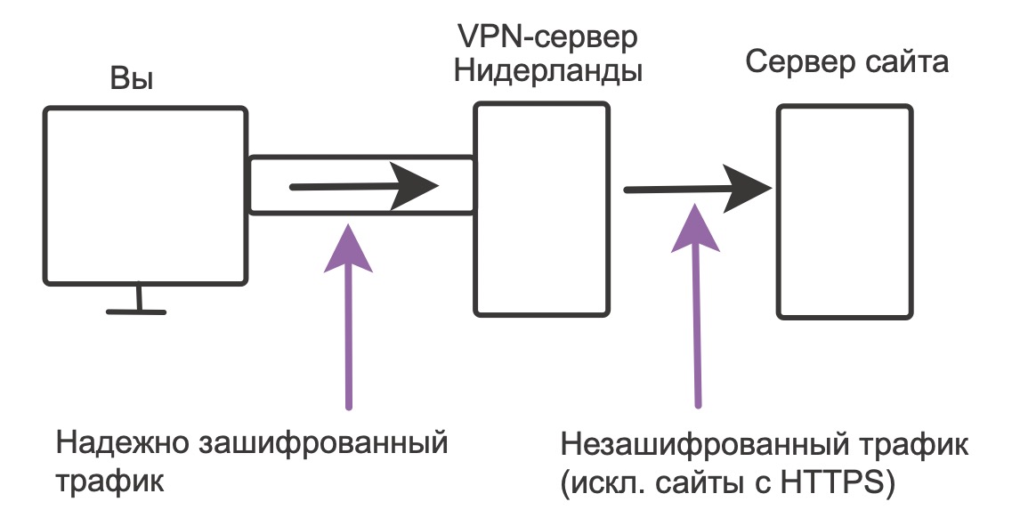 Представьте, что вы подключаетесь к сайту через VPN-сервер, расположенный в Нидерландах. Ваш трафик идет в зашифрованном виде до VPN-сервера, там расшифровывается и дальше идет до сайта. На схеме это выглядит так: