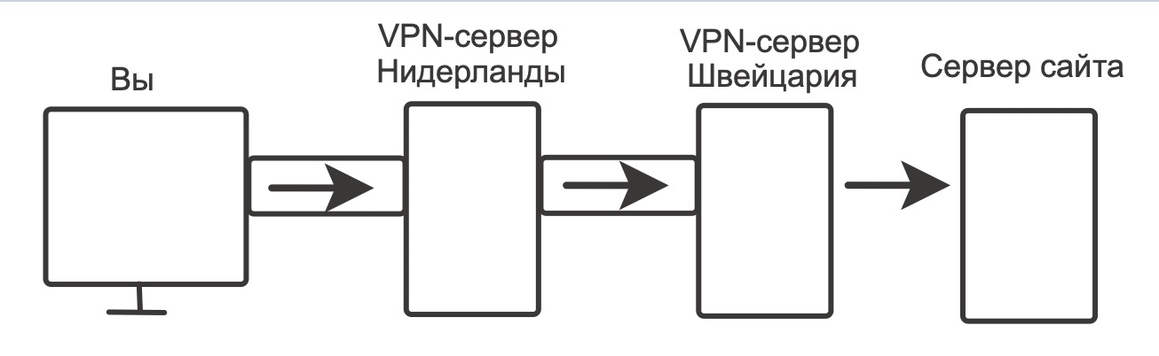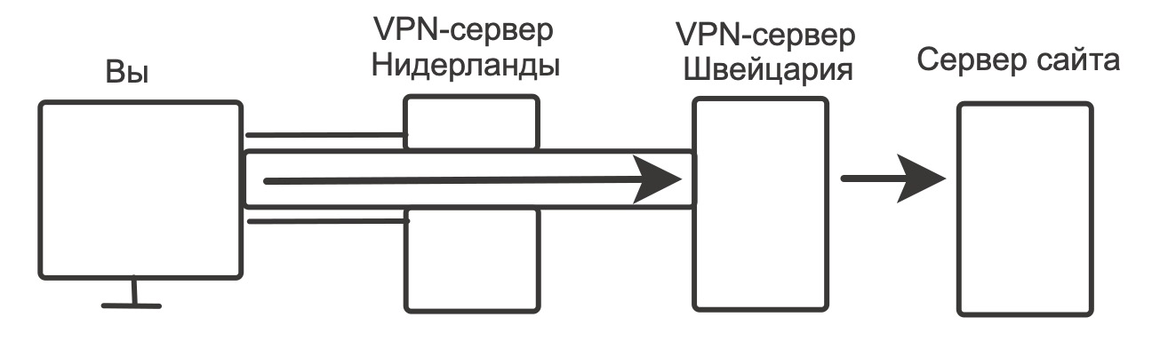 Если вы используете цепочку из VPN-серверов, например из двух VPN-серверов (Нидерланды и Швейцария), то интернет-трафик с первого VPN-сервера пойдет не на сайт, а в зашифрованном виде на второй VPN-сервер в Швейцарии и только затем на сервер сайта.
