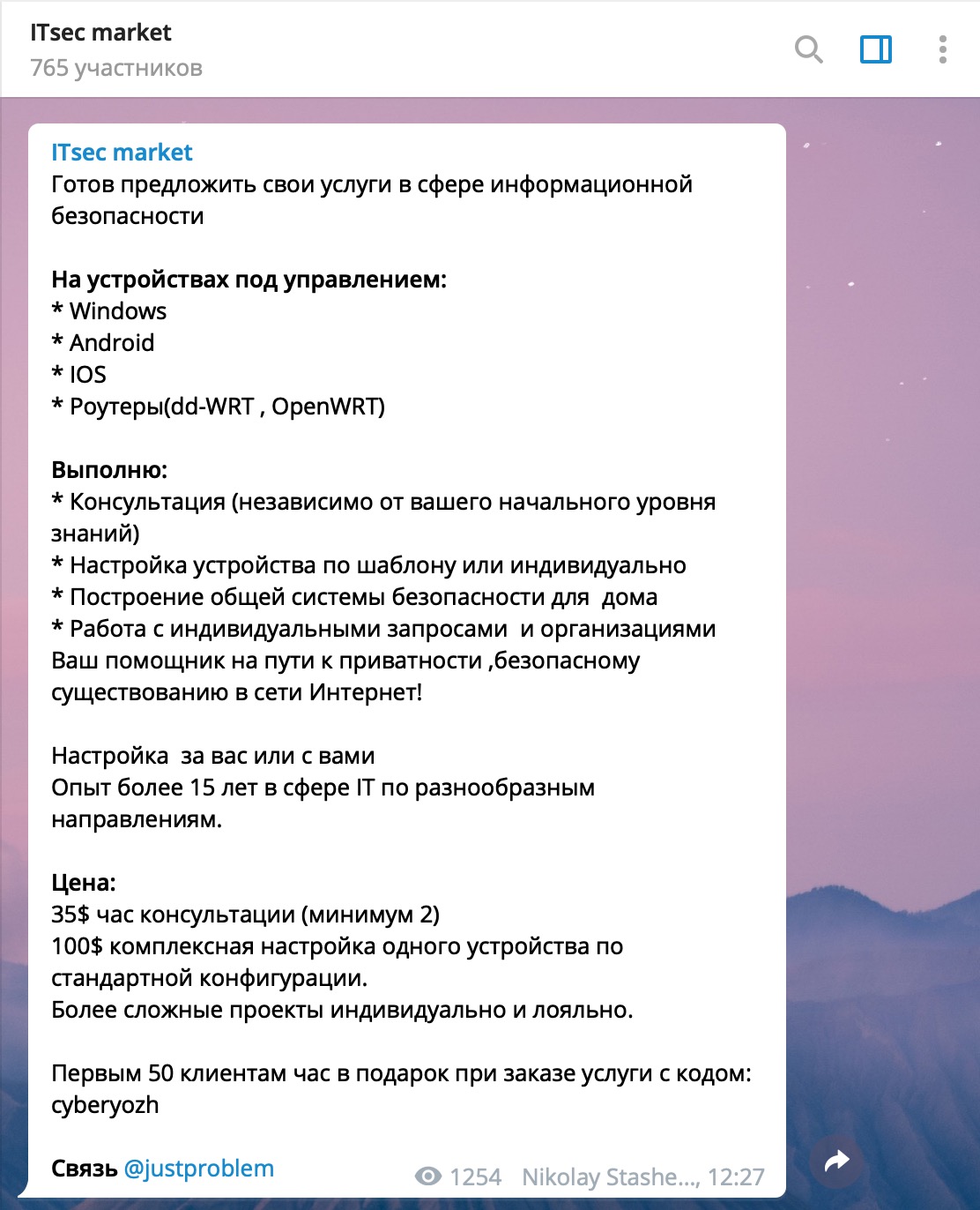 Мы готовы предложить вам место, где вы можете найти нужного специалиста. Это наш канал в Telegram ITsec market (@ITsec_market). Вам необходимо зарегистрироваться в Telegram и обратиться к нам (@cyberhackGL) с описанием вашей задачи или вашего вопроса. После этого данные будут опубликованы на канале, и с вами начнут связываться специалисты, готовые оказать вам помощь.